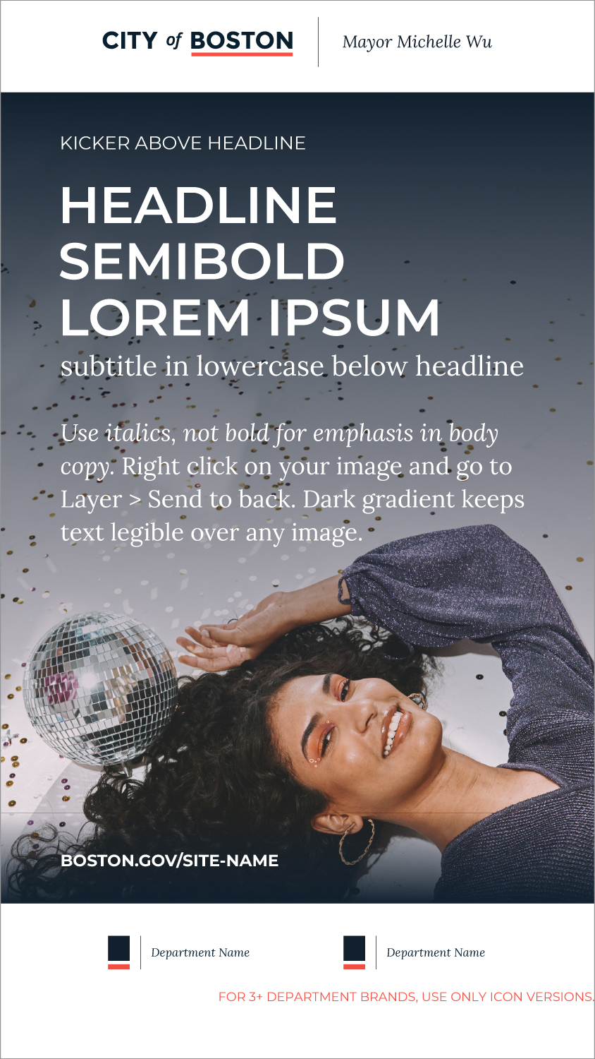 Multiple layout options are offered to ensure brand compliance, creative flexibility, and efficient production of Instagram posts, Instagram stories, and X (formerly Twitter) posts. The logo placement is established to reinforce that all departments represent the city of Boston.