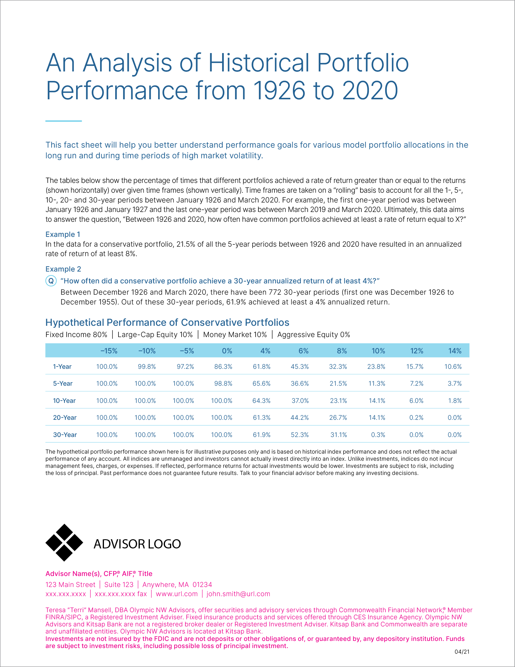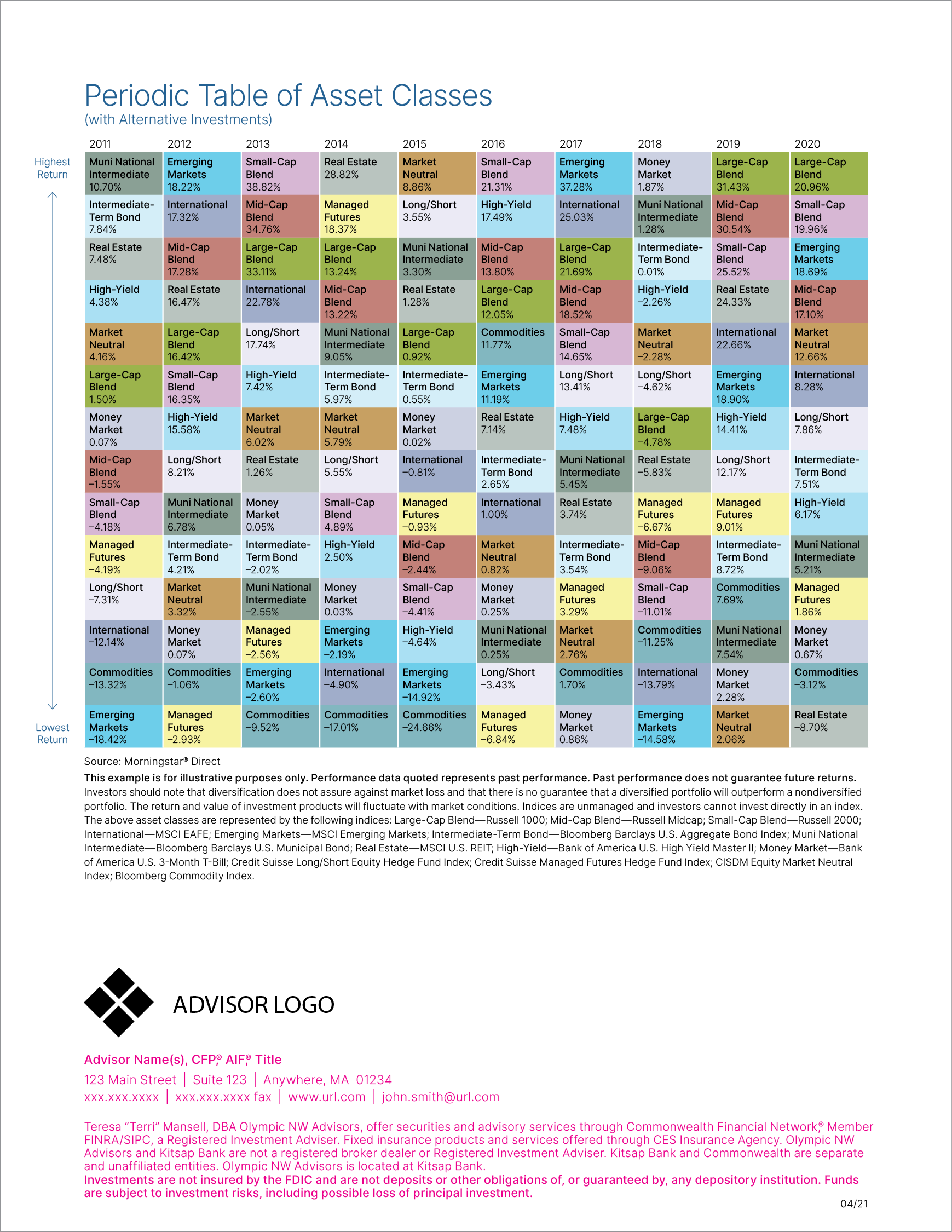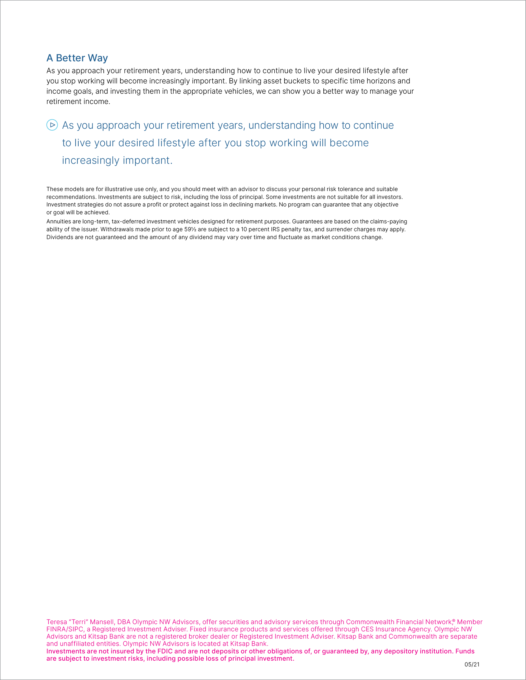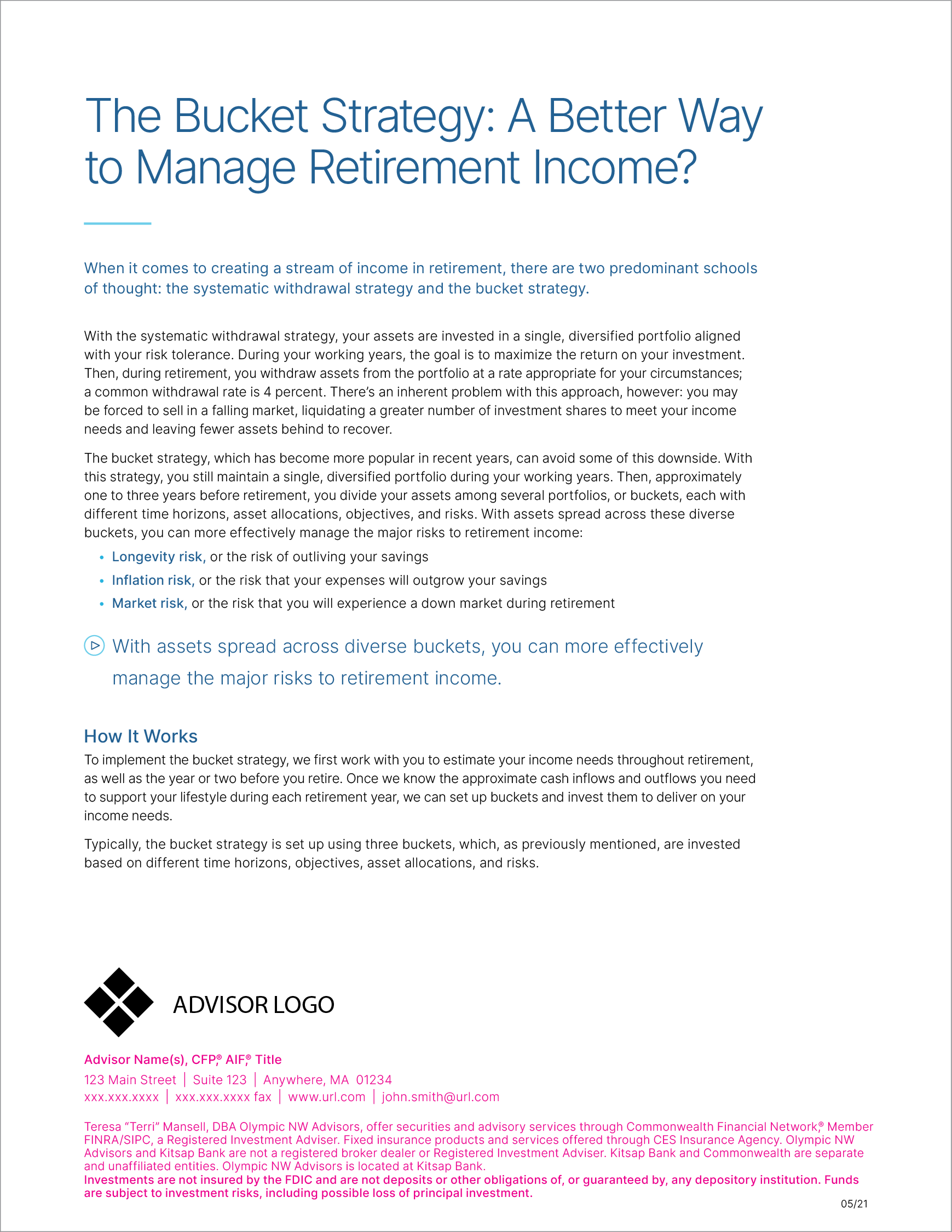 Compared to the Type Template, there were different challenges involved with building the template. We had to work with limited creative direction and parameters, which included no content changes and stock images. Also, we must leave a certain amount of space at the bottom for advisor logo, contact information, and disclosure language.