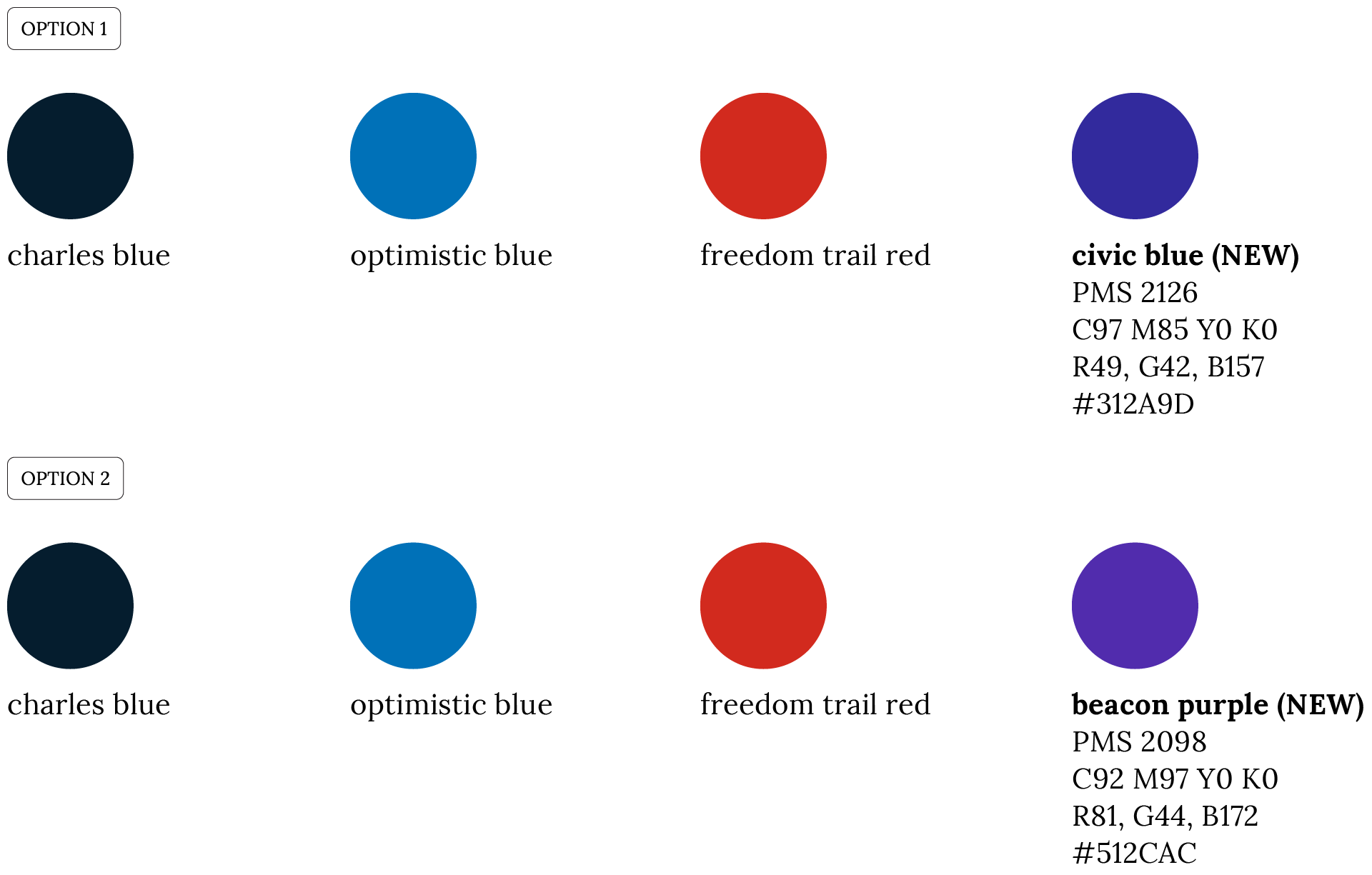 I’ve introduced two possible options for a new primary color. Based on the city’s values and aspirations, the ideal color would be in the blue-purple range.