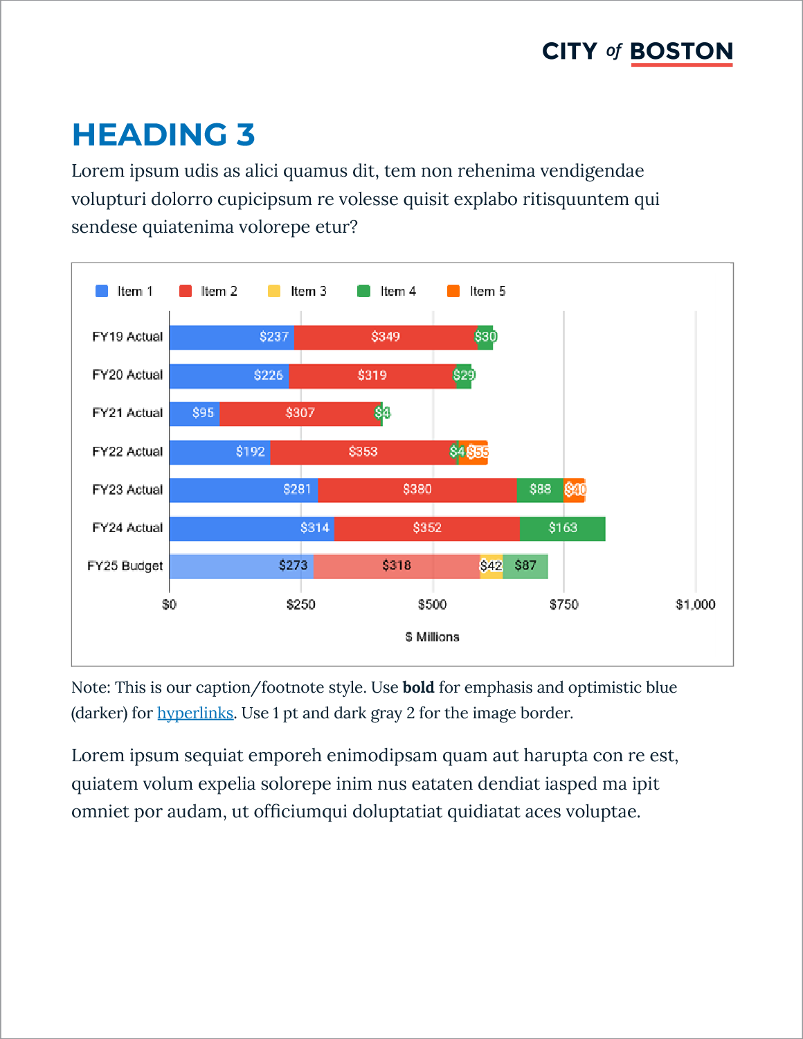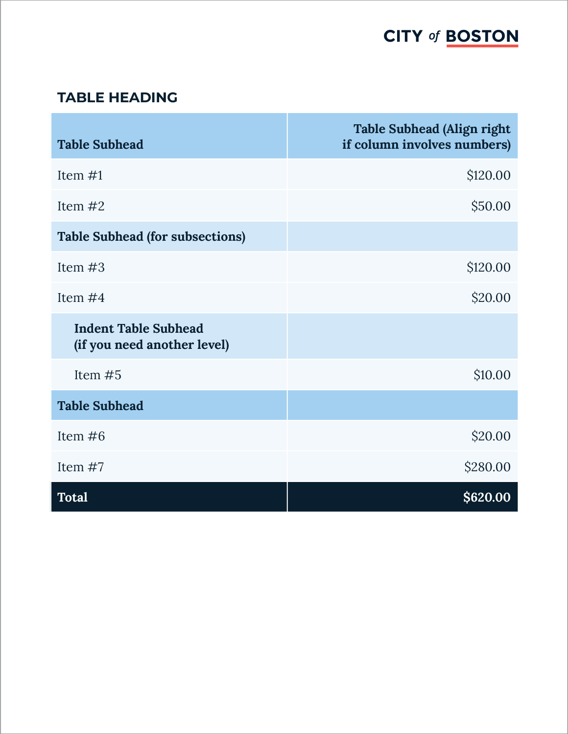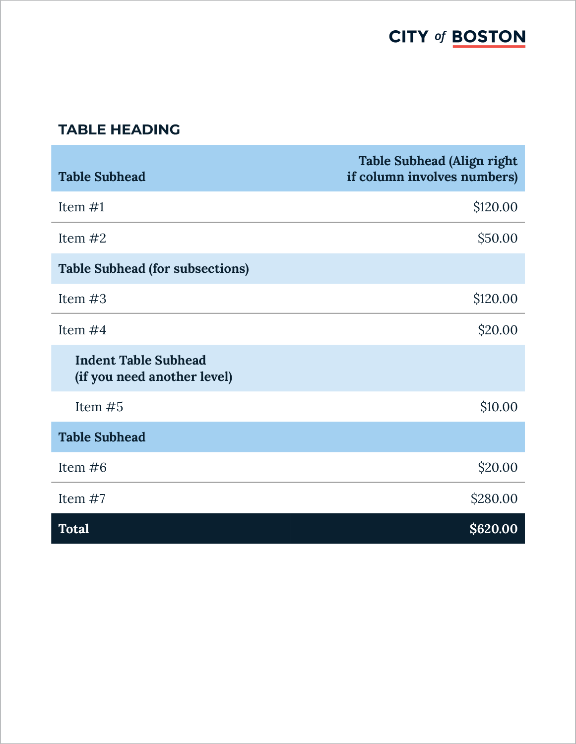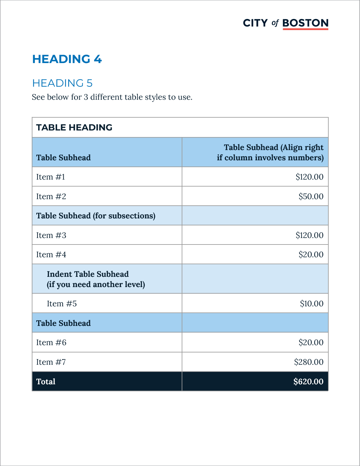 Standards include established text styles and typographic elements to create visual interest, enhance content hierarchy, and convey the city’s approachable tone. 3 different table styles are provided to give departments flexibility in presenting their information.